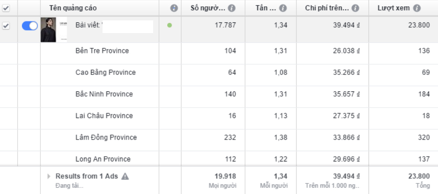 Chú ý trong ví dụ này mình loại bỏ Cao Bằng trong chiến dịch quảng cáo này nhưng ngay sau đó sẽ tạo lại quảng cáo tới những vùng vừa loại bỏ xong, mục đích là không bỏ lỡ khách hàng khu vực đó, lí cho CPM cao chỉ là ở chiến dịch này mình đang bị rơi vào vùng có cạnh tranh nhiều giá thầu cao tại địa phương đó. Tạo mới quảng cáo bạn sẽ có được mức CPM tối ưu hơn và dành ngân sách lan tỏa tốt hơn.