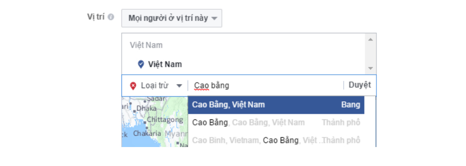 Khu vực Cao Bằng đang có CPM cao mà lượt xem của người quan tâm đang rất thấp, do đó mình quyết định loại bỏ vùng miền này trong chiến dịch quảng cáo bằng cách vào chỉnh sửa set thêm vùng loại trừ.