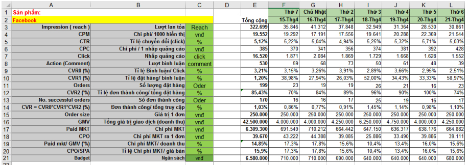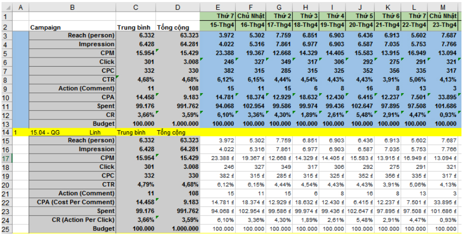 Mình có tự tạo ra một file quản lý các chỉ số để căn cứ vào đó có thể xác định được chiến dịch nào đang tốt chiến dịch nào đang không tốt, file excel sẽ có dạng như hình sau các bạn có thể tham khảo các chỉ số này: