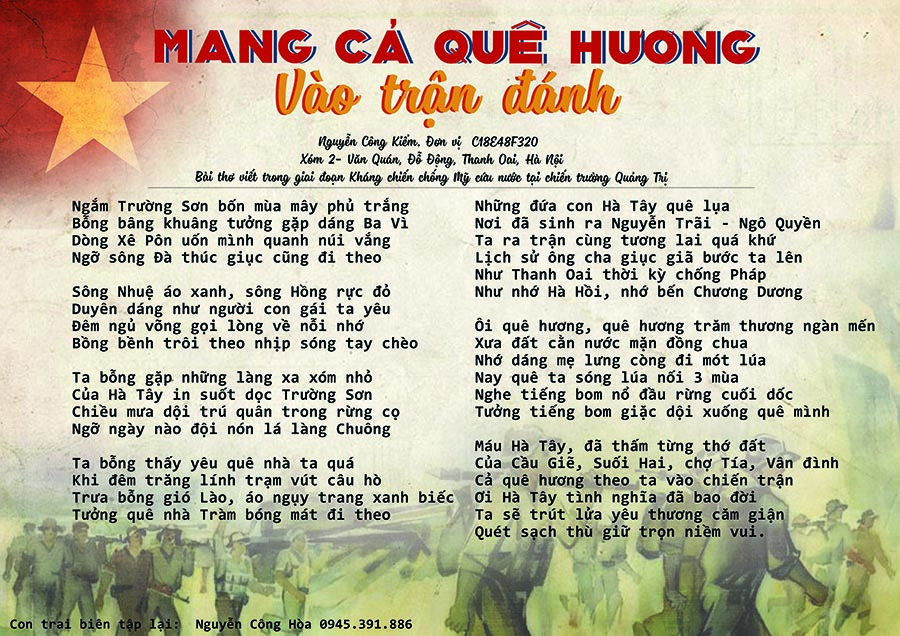 Bài thơ nói trên được viết trong thời kỳ chống Mỹ cứu nước. Tôi nghĩ bố tôi đã viết một bài thơ cực kỳ tuyệt vời, có thể đọc thấy rõ được tình yêu quê hương vô bờ bến của ông cũng như am hiểu lịch sử địa lý và trải nghiệm thực tế. Các địa danh của Hà Tây được nêu lên cùng với lịch sử hào hùng của cha ông. Với áng văn đầy tình yêu thương con người trong đó, với hình bóng quê nhà đang phảng phất trong mỗi bước đi xa. Bài thơ được trích trong cuốn Hồi Ký của bố tôi. Niềm tự hào của gia đình.