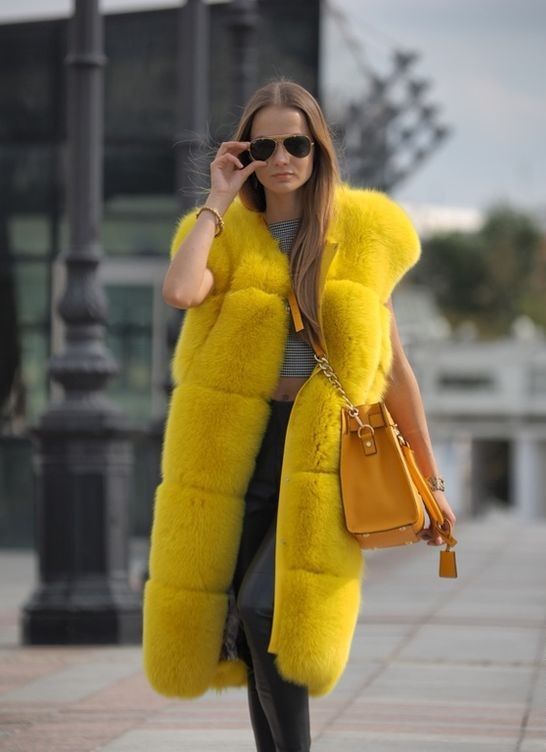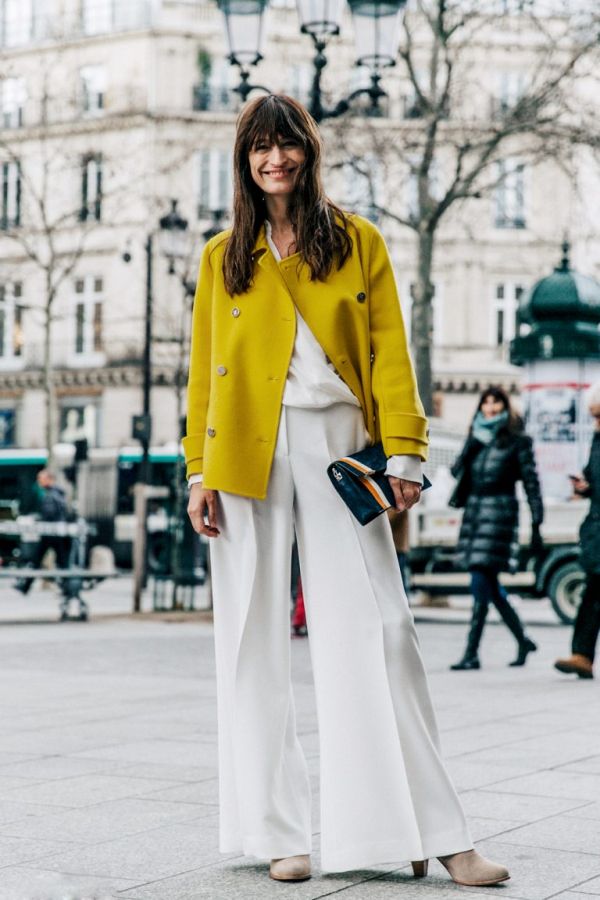 Chân váy, quần màu trắng cũng là item phù hợp đi cùng áo len, áo khoác màu vàng.