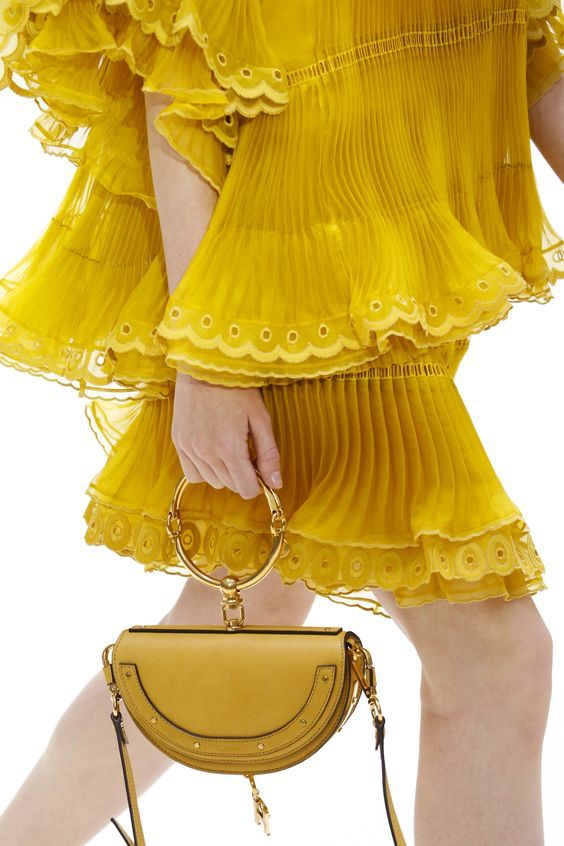 Nguyên cây vàng cùng phụ kiện màu đen sẽ nâng tầm set đồ của nàng lên rất nhiều. Màu vàng Primrose cực hợp với phụ kiện trang trí ánh kim sang trọng. Cả hai sẽ càng sành điệu và thời thượng khi đi cùng nhau.