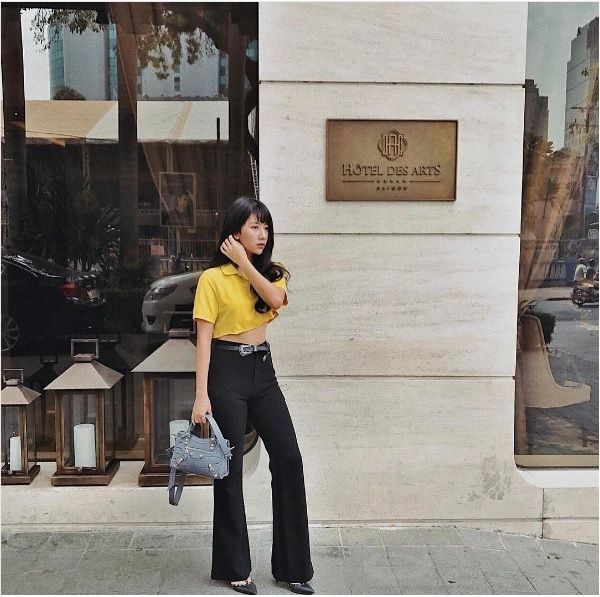 Cô nàng Quỳnh Anh Shyn cũng có set đồ mang hơi hướng thời trang thập niên 80 với chiếc áo sơ mi màu vàng Primrose cách điệu.